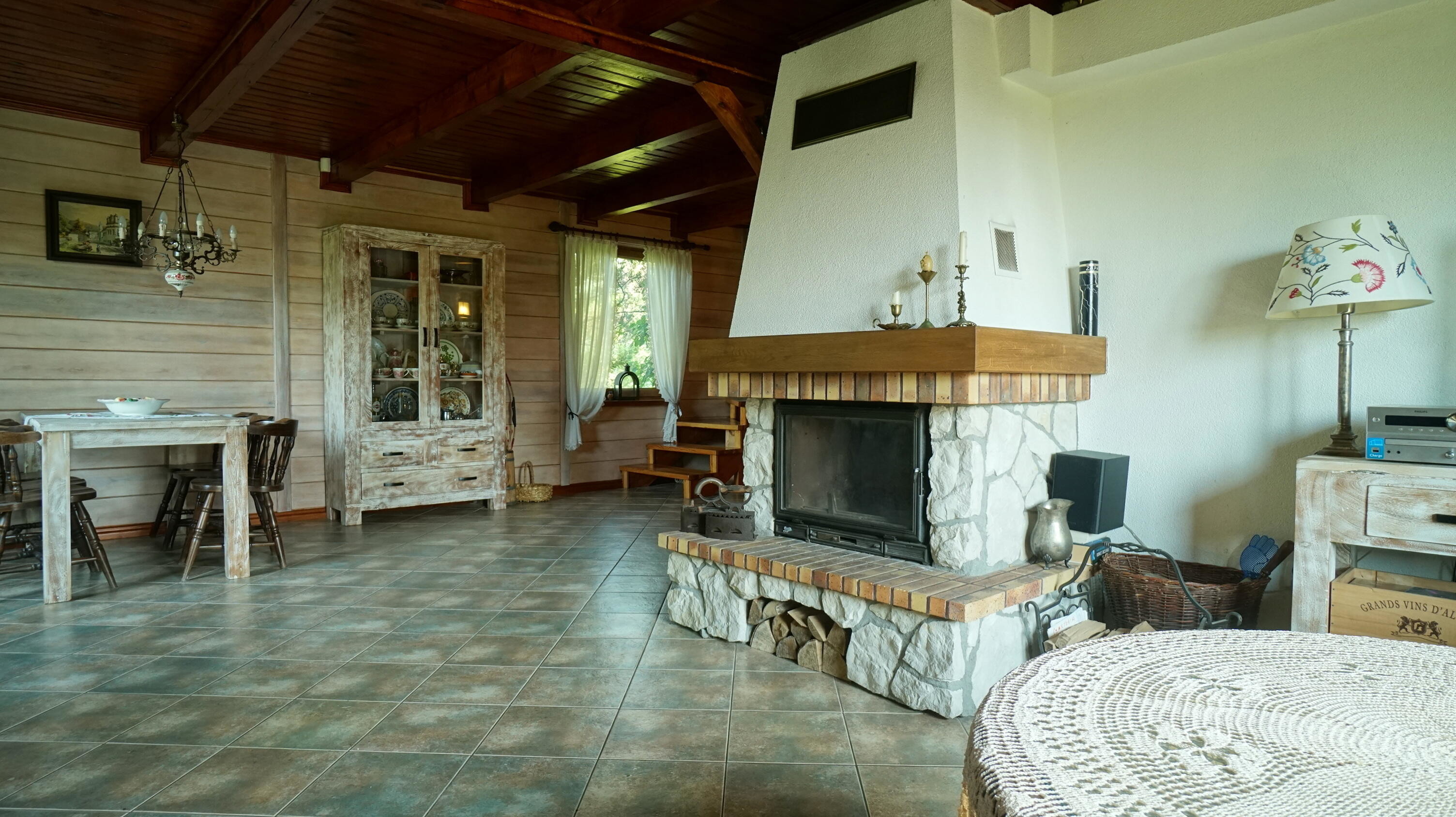 - otwarty salon z aneksem kuchennym, jadalnią i kominkiem (50 m2)
